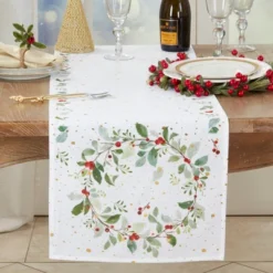 Saro Lifestyle Holiday Cheer Berry Wreath Table Runner, White, 16″ X 72″