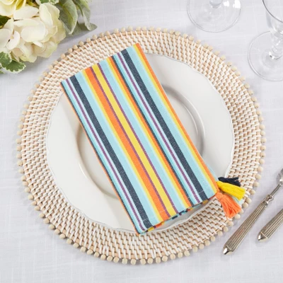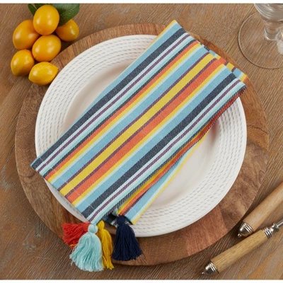Bring whimsy and glee to your tabletop with these charming table Napkins. Featuring bright colors and finished with vivid tassels, these cotton table napkins are absolutely delightful. You can pair them with matching runner and placemats for a coordinated look, or with solid colors for a contrasting effect.